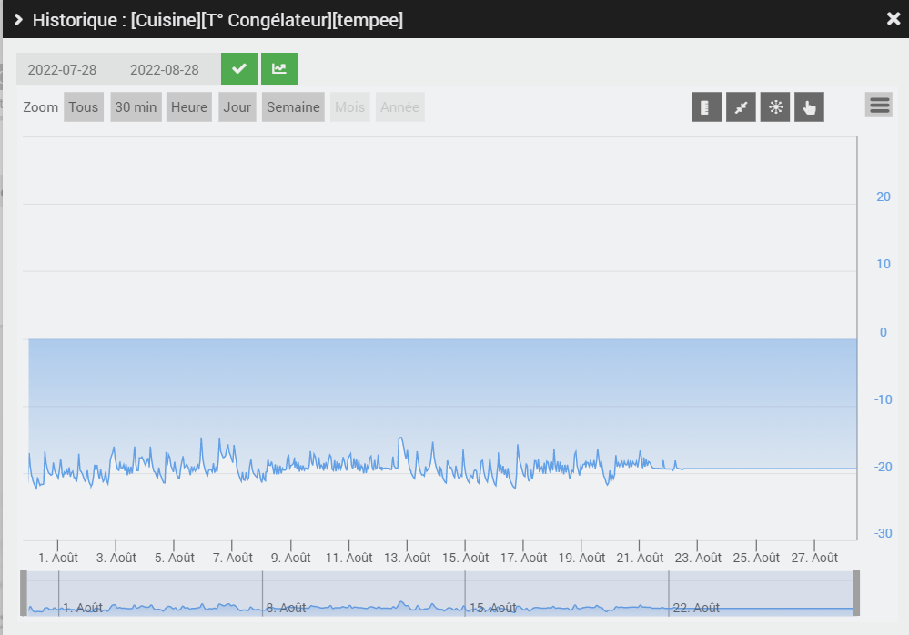 je n’arrive pas a croire que la valeur du congélateur ne flutu pas un peu. Idem pour la batterie, même date de valeur . je suis partie depuis le 20 aout, et les dernieres dates de valeur temp et batterie sont au 22 aout