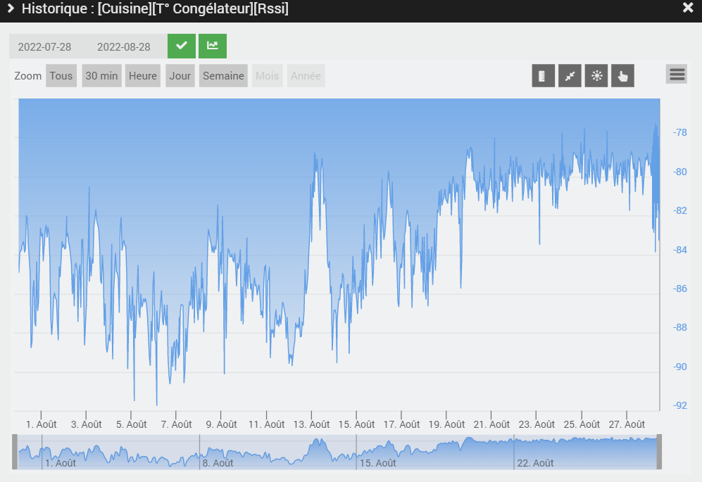 je suis en vacances loin de chez moi, je checke chez moi et je vois que ma sonde de température du congélateur ne remonte plus les valeurs hormis le RSSI.