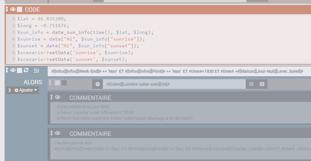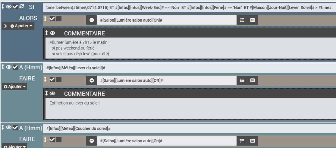 Le matin tout va bien, à 7h15 le scénario se déclenche pour allumer puis se relance au levé du soleil pour éteindre.