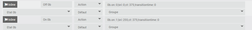 Je ne sais pas exactement ce qu’il faut que tu mette mais sur le principe, sur ta commande "on " par exemple, après la commande par défaut, tu mets un point-virgule et ajoute la commande que tu veux envoyer en même temps. 11::on_off::on;11::level::move_to_level::255::0