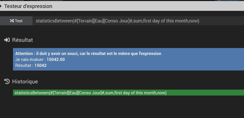 Sachant que l’historique est bien activé sur #[Environnement][Cumul Pluie][Veille]#, quand je teste l’expression, j’ai systématiquement un résultat « » même en jouant sur d’autres paramètres month…