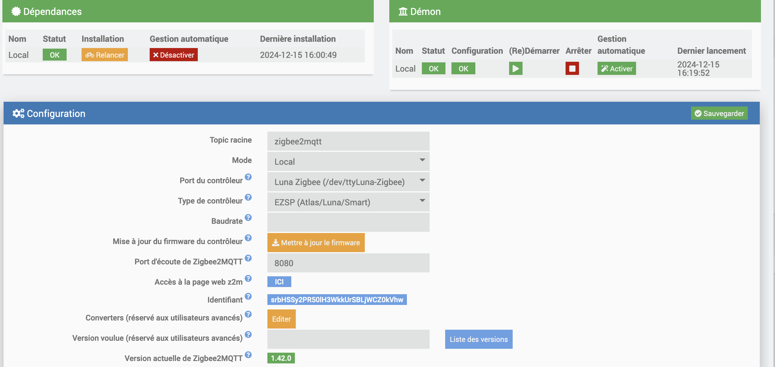 Les dépendances sont installées et les démons (MQTT et JeeZigbee) semblent bien démarré.
