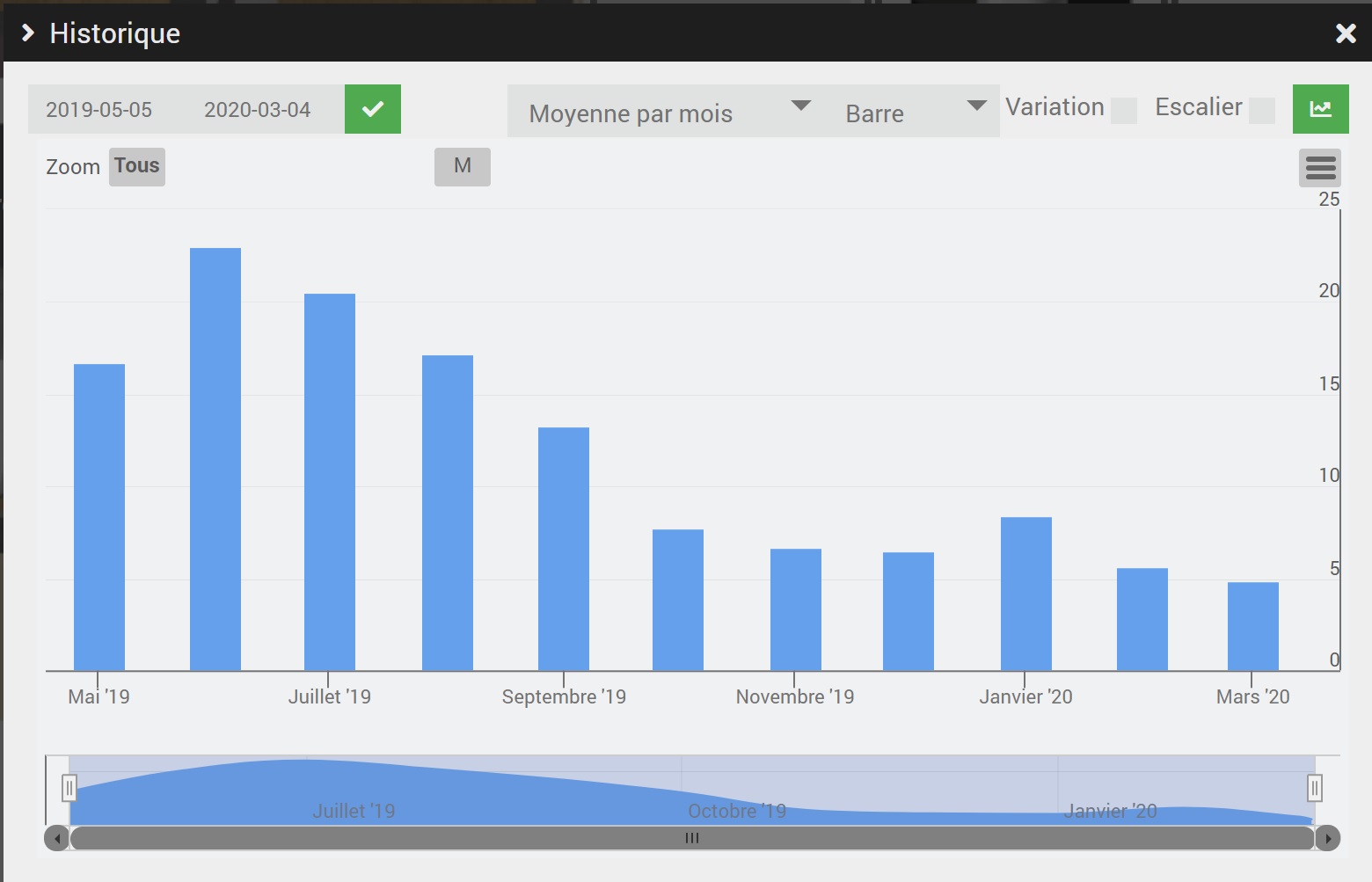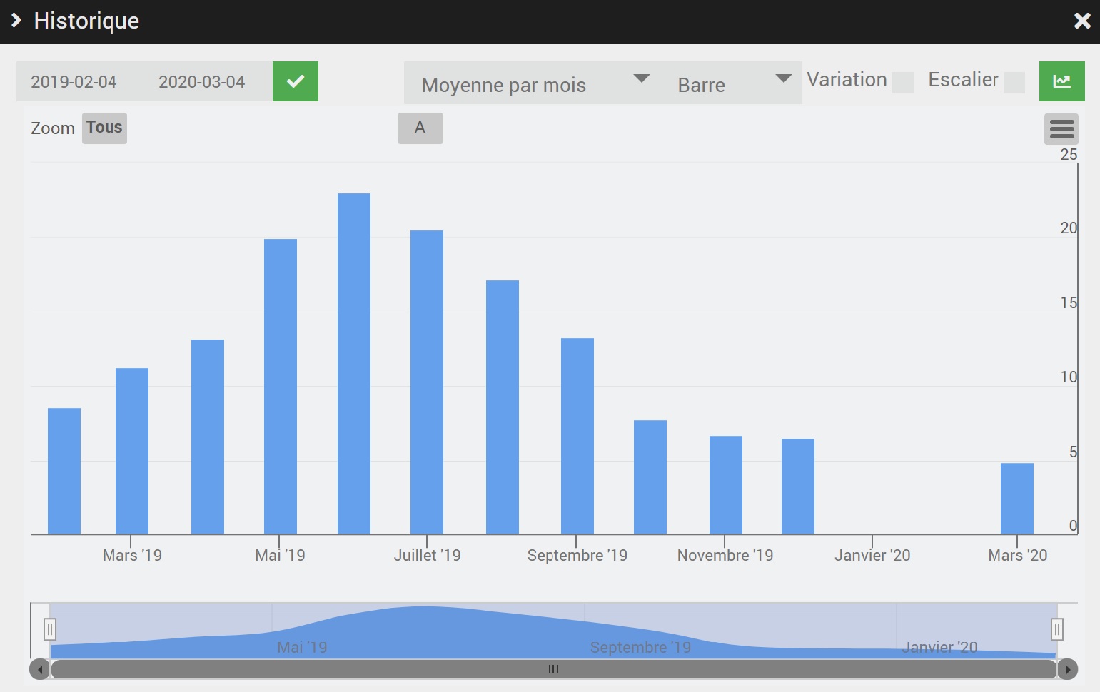 J’ai un problème sur les graphiques. Quand je prends une grande période avec des barres, et un groupement (par exemple, moyenne par mois ou max par mois), il y a des trous. Pourtant, si je diminue la période, ces mêmes endroits où il y avait des trous sont maintenant OK. Voir capture ci dessous avec période sur un an (il y a des trous(, puis en enlevant quelques mois (plus de trous).