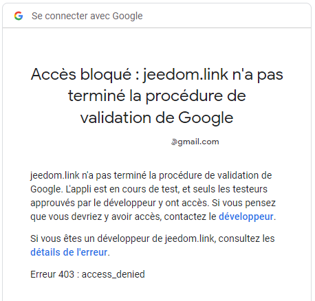 Le problème est que Jeedom n’a pas encore validé ce domaine comme domaine de confiance pour Google (procédure de validation en cours vu le message).