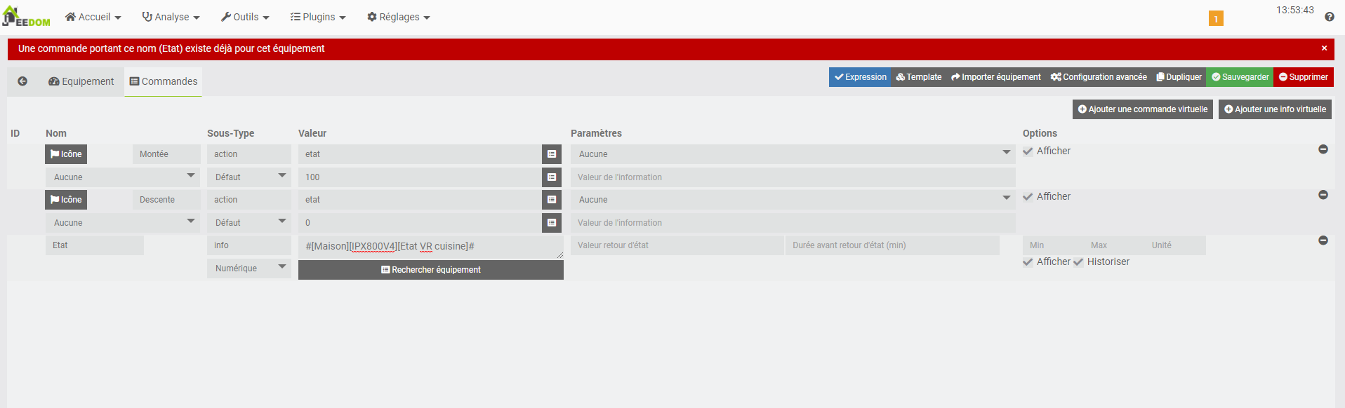 J’ai bien les curseurs et retour d’état dans le résumé de l’IPX sur dashboard, mais impossible de créer un virtuel pour chaque pièce ( ex : virtuel volet cuisine dans objet cuisine ) avec bouton montée/stop/descente et retour d’état