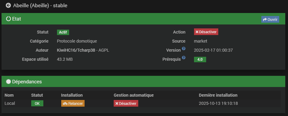 les dépendances du plugin Abeille s’installent bien et le daemon est ok.