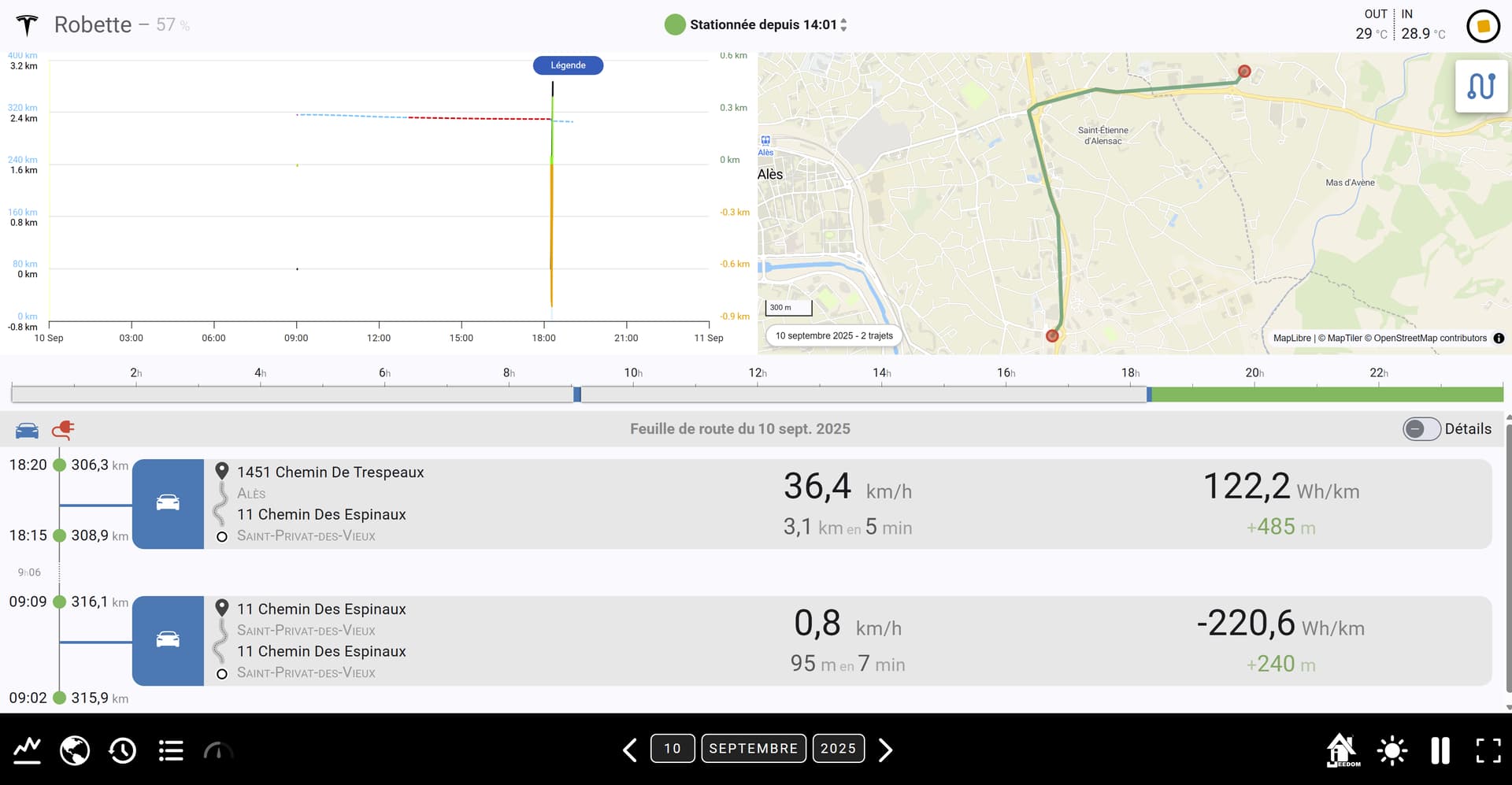 quatrième jour : pas de trajets du matin et le véhicule se situe (capture à l’instant) à 100 km de ce qu’affiche la carte)