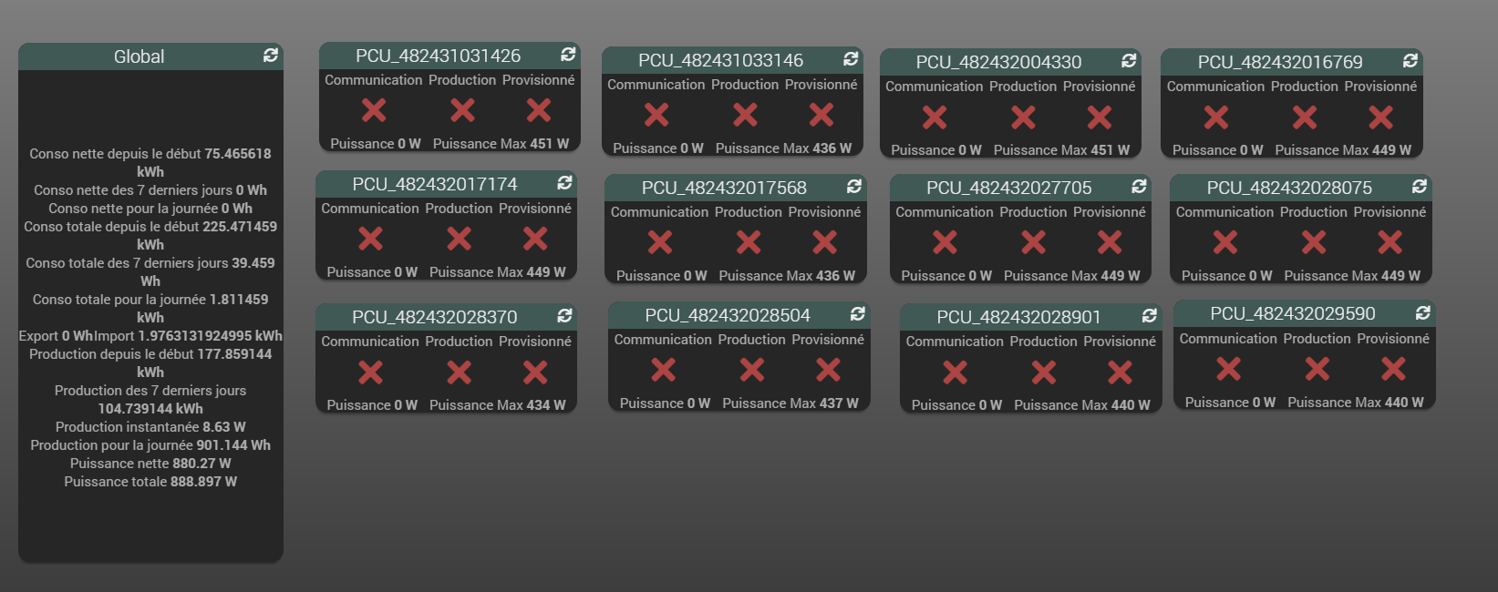 La nuit j’ai une production instantanée de 9KWh alors que mes 12 panneaux produisent bien 0