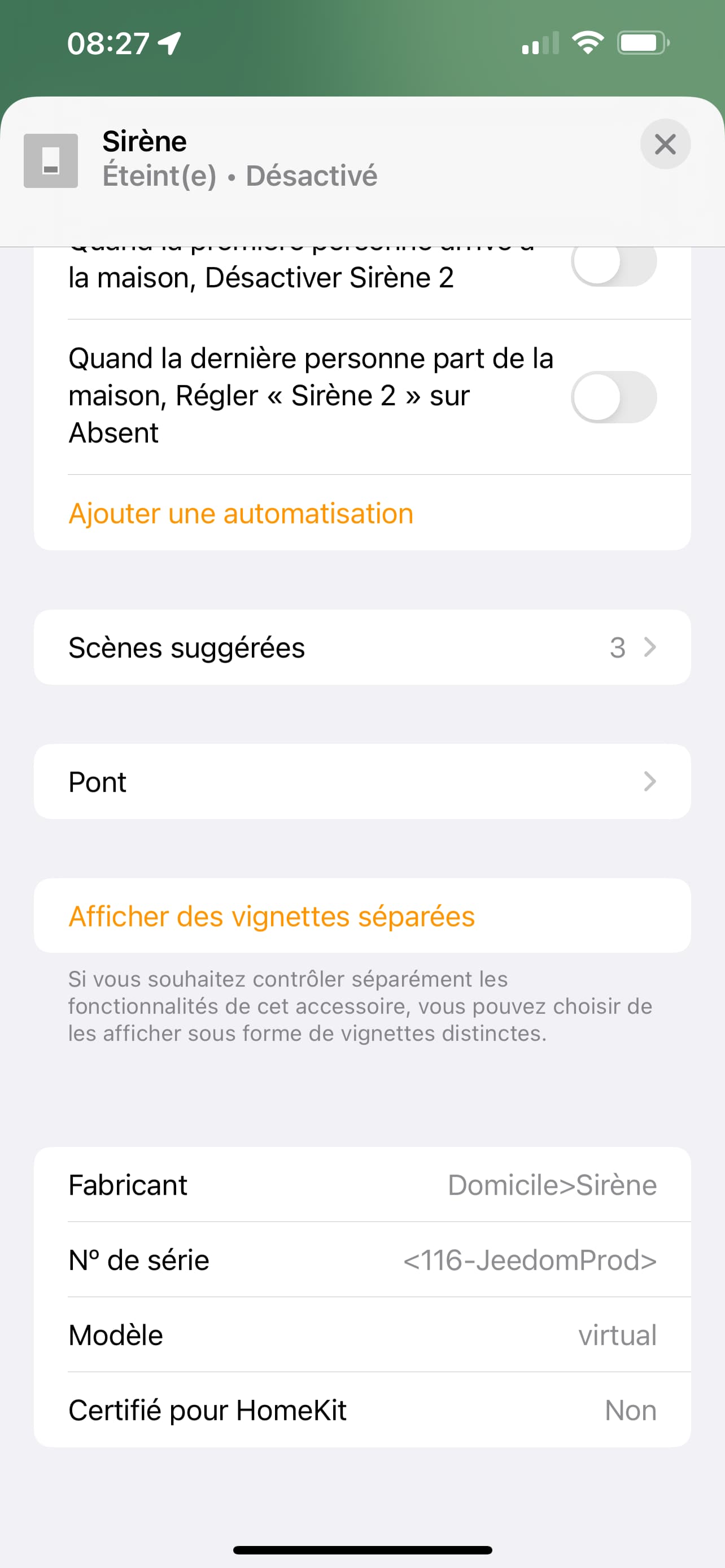 Jeedom propose une bonne gestion des objets pour créer une sorte de hiérarchie et ou zonage des équipements qui le compose. Néanmoins, lors de la synchronisation avec homekit, les pièces ne sont pas reprises (pas de lien pour configurer cela donc c’est normal), et l’ensemble de nos équipements se retrouvent créé dans la pièce par défaut lors de l’ajout.
