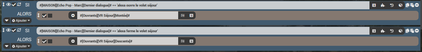 SI #[MAISON][Echo Pop - Marc][Dernier dialogue]# == "alexa ouvre le volet séjour"