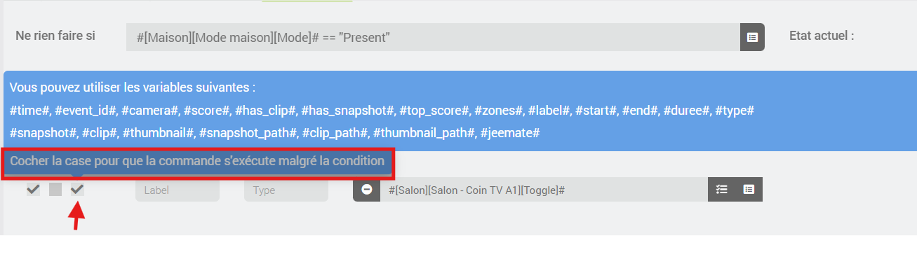 Je commence a avoir un système qui fonctionne bien, cependant dans la partie Action(s) on peut activer/désactiver l’ensemble des actions avec une condition. Dans un premier temps ça répondait parfaitement à mon besoin (et probablement à ceux des autres utilisateurs