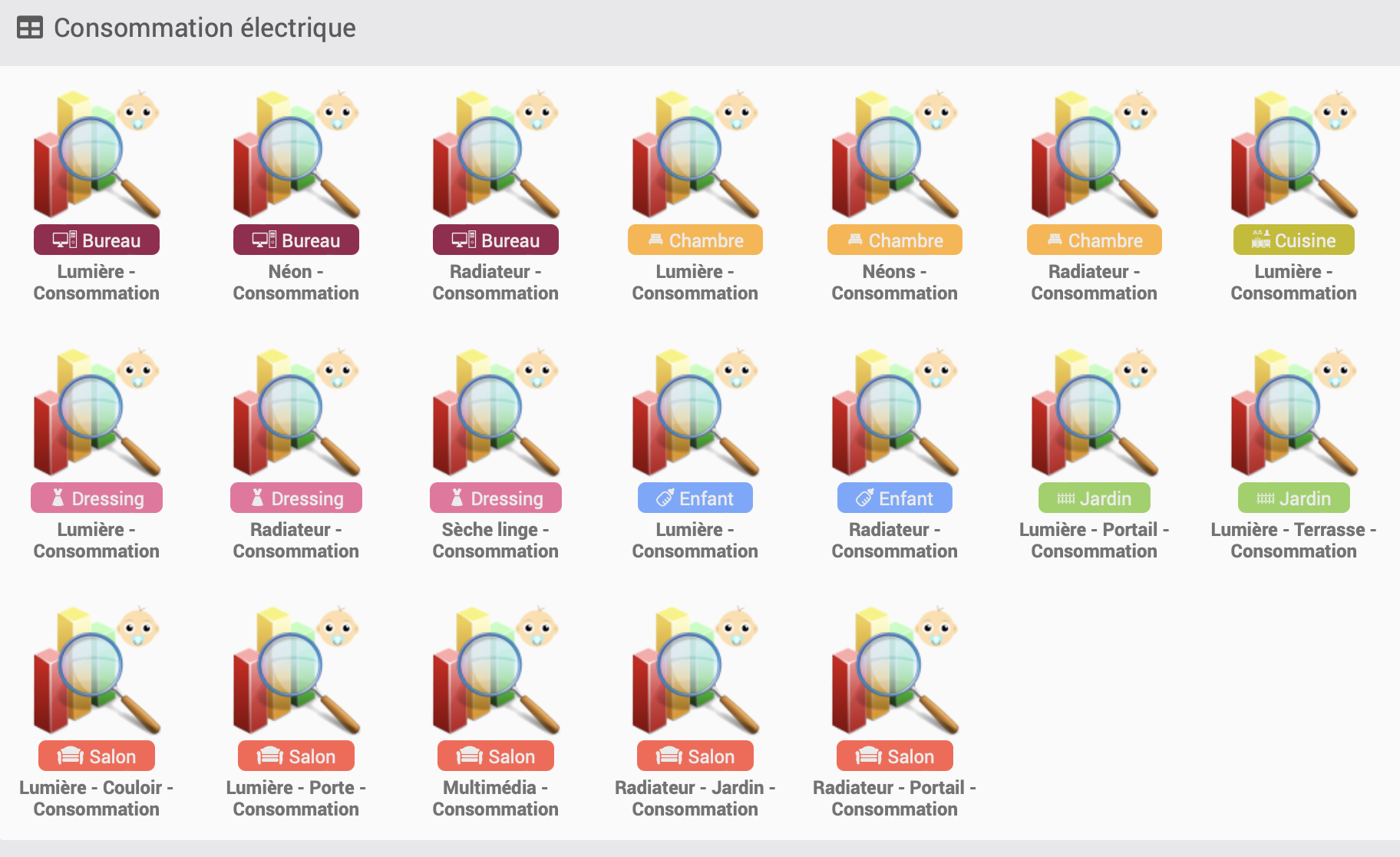 Je viens du plugin « Energy » qui est malheureusement complètement outdated ;( (même les dev le disent). Il a bien des défauts mais je trouvais en tout cas très pratique le graphique par pièce car il m’est arrivé de me demander pourquoi telle ou telle pièce tire du courant alors que je ne le pensais pas et il s’est avéré qu’il y a avait des soucis dans mes scénarios qui déclenchaient les radiateurs inutilement, donc vraiment très pratique :