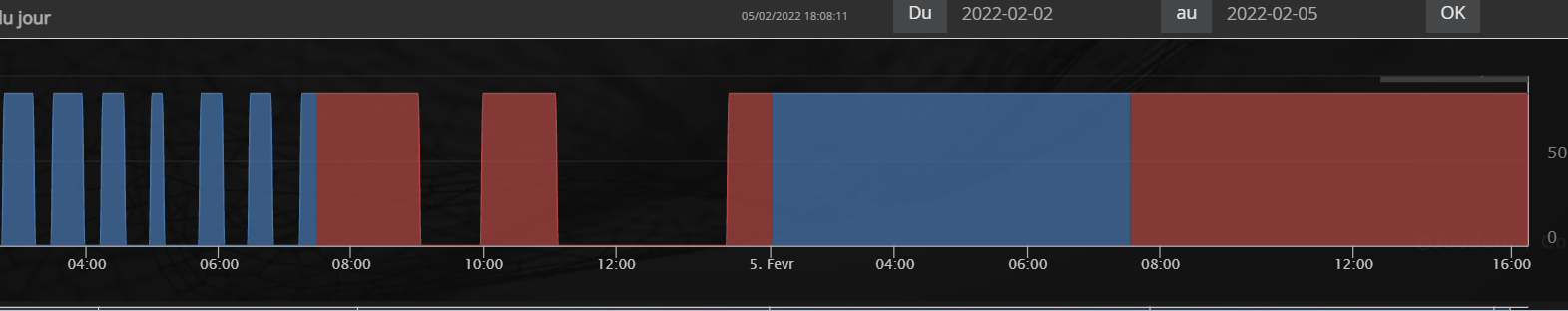 voici un exemple pour un thermostat cela est apparu sur l’(ensemble des mes equipement de suivi conso basé sur 1 ou 0 et est apparu le mercredi 2 février vers 14h je ne sais pluis si il y a eu une mise à jour ou non. voici me graph d’un thermostat par exemple: