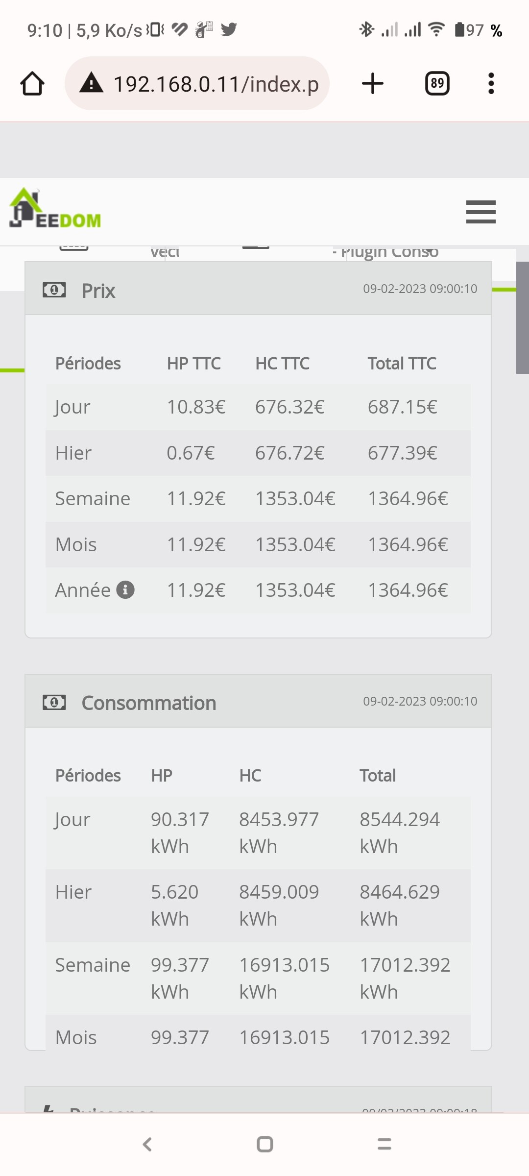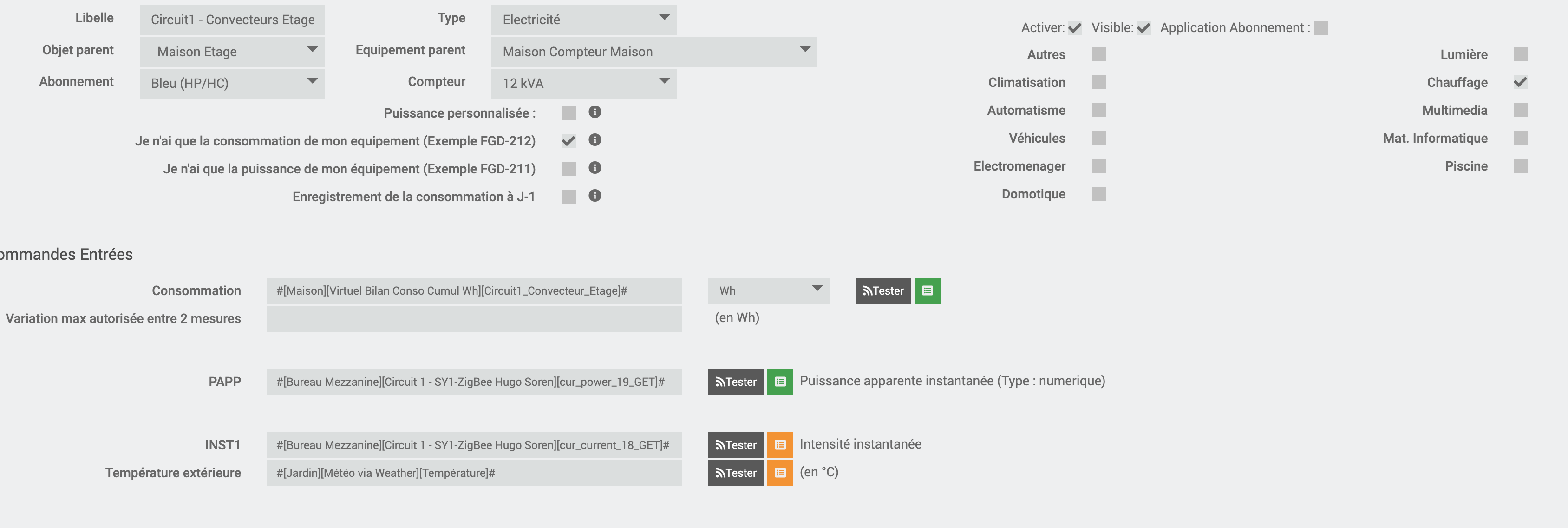 1- Mes convecteurs étages sont reliés dans mon tableau électrique à un disjoncteur connecté qui me remonte power / courant / voltage. La consommation étant remise à zéro tous les soirs, elle n’est pas utilisable.