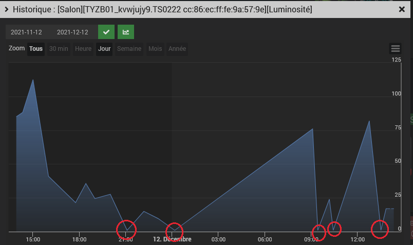A chaque refresh (effacement écran pour se ré-afficher), on dirait que les valeurs sont comme remise à zéro puis ré-évalué juste après. Sur l’affichage du module c’est relativement transparent (quoi que je l’ai observé avec des températures délirantes quand même juste après ce refresh) mais pour les lux c’est un retour à 0 à chaque fois (que Jeedom voit comme un « 1 »).