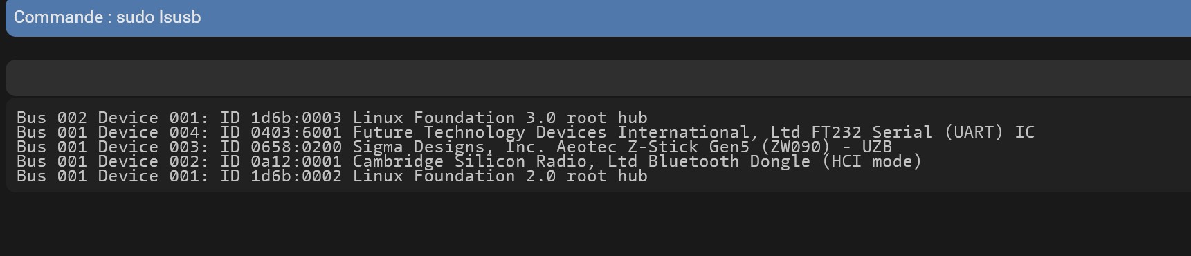 [2025-06-29 16:48:45] e[34mdebuge[39m: zh:adapter:discovery: Connected devices: [{"path":"/dev/ttyACM0","manufacturer":"0658","pnpId":"usb-0658_0200-if00","vendorId":"0658","productId":"0200"},{"path":"/dev/ttyS0"},{"path":"/dev/ttyS1"},{"path":"/dev/ttyS2"},{"path":"/dev/ttyS3"},{"path":"/dev/ttyUSB0","manufacturer":"RFXCOM","serialNumber":"A11B5YTU","pnpId":"usb-RFXCOM_RFXtrx433_A11B5YTU-if00-port0","vendorId":"0403","productId":"6001"}]
