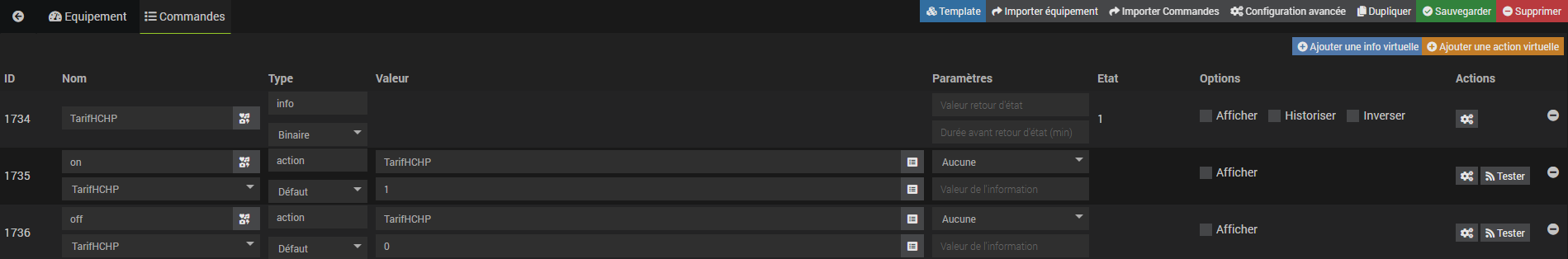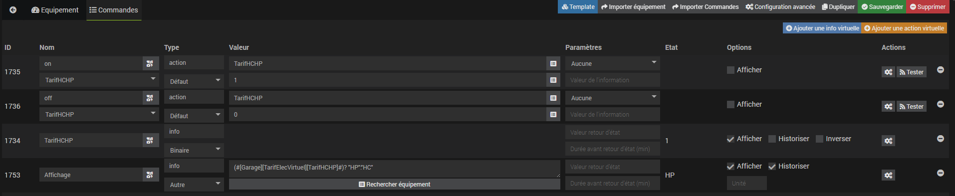 Une seule commande info/binaire dans un virtuel nommée tarifHPHC (par exemple) qui prendra la valeur de 1 sur HP et 0 si HC