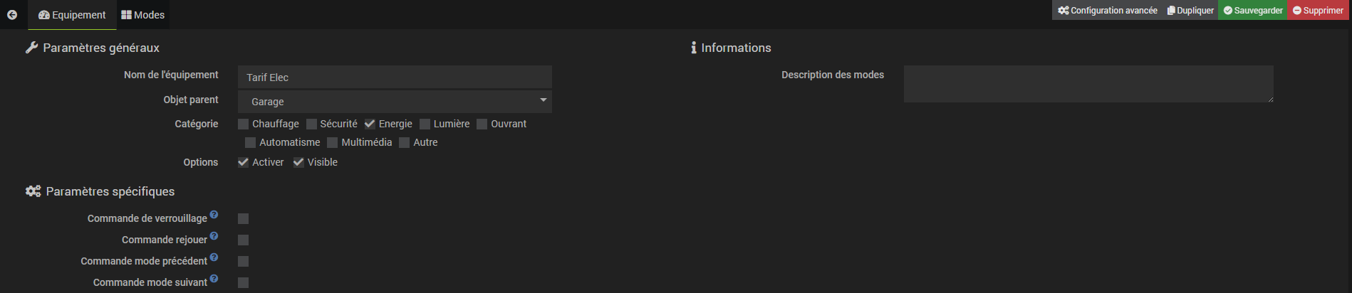 J’ai créé un équipement virtuel nommé « TarifElecVirtuel » qui répond à la configuration suivante :