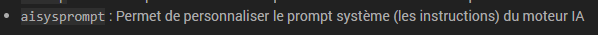 Et donc, cela permet de personnaliser les instructions (ce qui est demandé) du moteur IA, en remplaçant le prompt qui est inclus dans le plugin (qui en résumé, demande de répondre à la question s’il y en a une, et dans tous les cas de reformuler sur un ton enthousiaste et humoristique (ou bien le ton défini par l’utilisateur), sans utiliser d’emojis, d’url, et quelques autres truc que je n’ai plus en tête