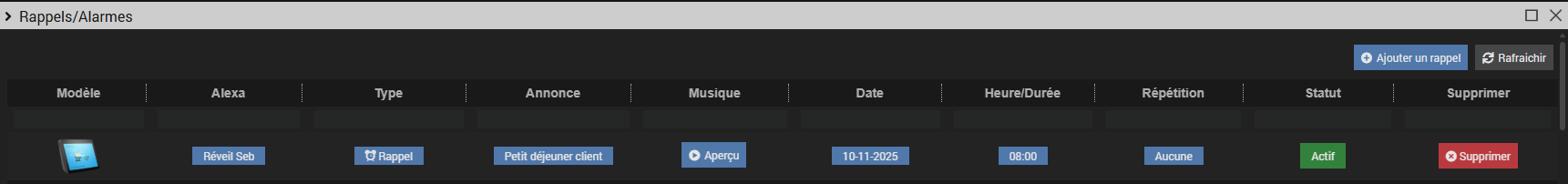 - Je demandais à mon echo show de programmer un rappel avec un label particulier (« Petit déjeuner Client »)