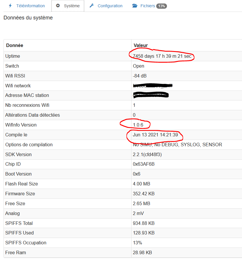 Et là, je suis toujours en 1.0.6 avec toute la conf déjà faite pour la box et jeedom…il indique un uptime depuis 7458 jours…wifiinfo 1.06 => pas top. Compilation aujourd’hui à 14h21 donc ça c’est conforme