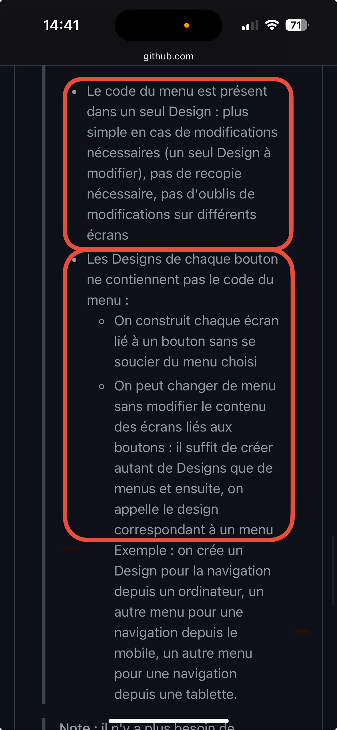 Et au final tu ne lances plus tes designs de contenu. Tu lances seulement le design XX du menu. Le menu sera toujours visible et ne bouge pas, seul le contenu changera à l’écran en fonction des clics sur chaque bouton du menu