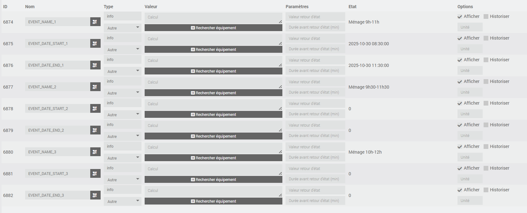 cmd::byString("#[Maison][vProchain créneaux ménage][EVENT_NAME_$i]#")->event($event->getName()); // Ici il faut remplacer les XXXX par le chemin de la commande du virtuel. On renseigne la commande EVENT_NAME avec le nom de l'événement. On remarque que le compteur $i nous est utile pour itérer.