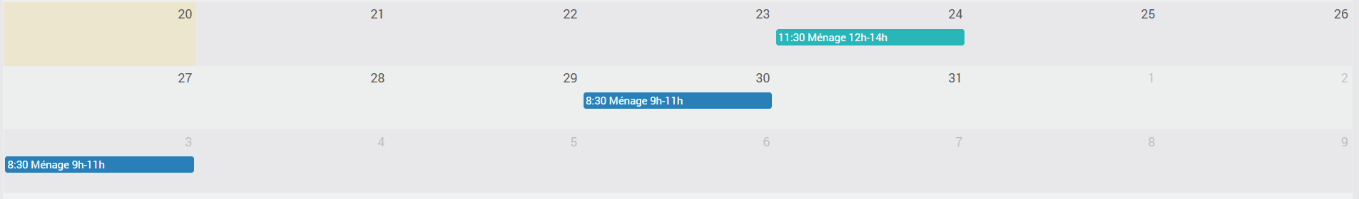 cmd::byString("#[Maison][vProchain créneaux ménage][EVENT_DATE_END_$i]#")->event($event->nextOccurrence('end')); // Ici il faut remplacer les XXXX par le chemin de la commande du virtuel. On renseigne la commande EVENT_DATE_END avec la date de fin de l'événement. On remarque que le compteur $i nous est utile pour itérer.