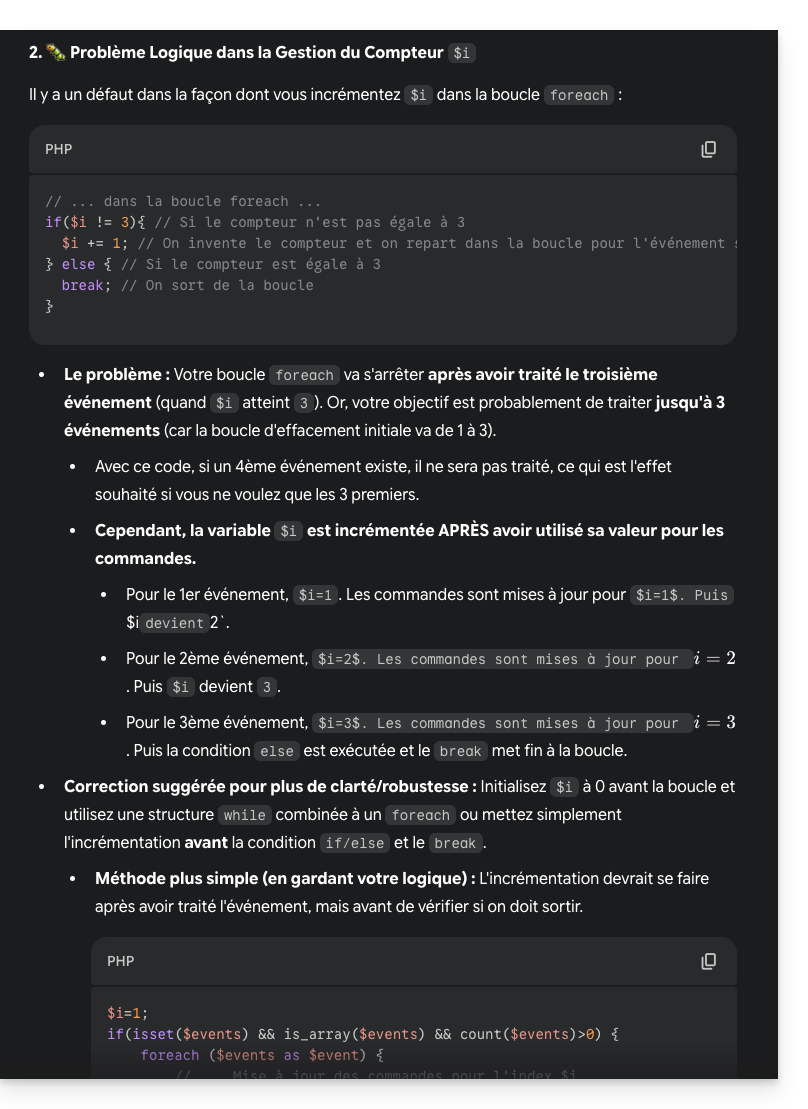bref, d’abord gemini parle des accents et des espaces, cela peut etre une raison… mais je crois pas que ca m’avait impacté. mais surtout gemini mentionne la partie de la boucle, et qui semble correspondre aux symptomes dont tu parlais: