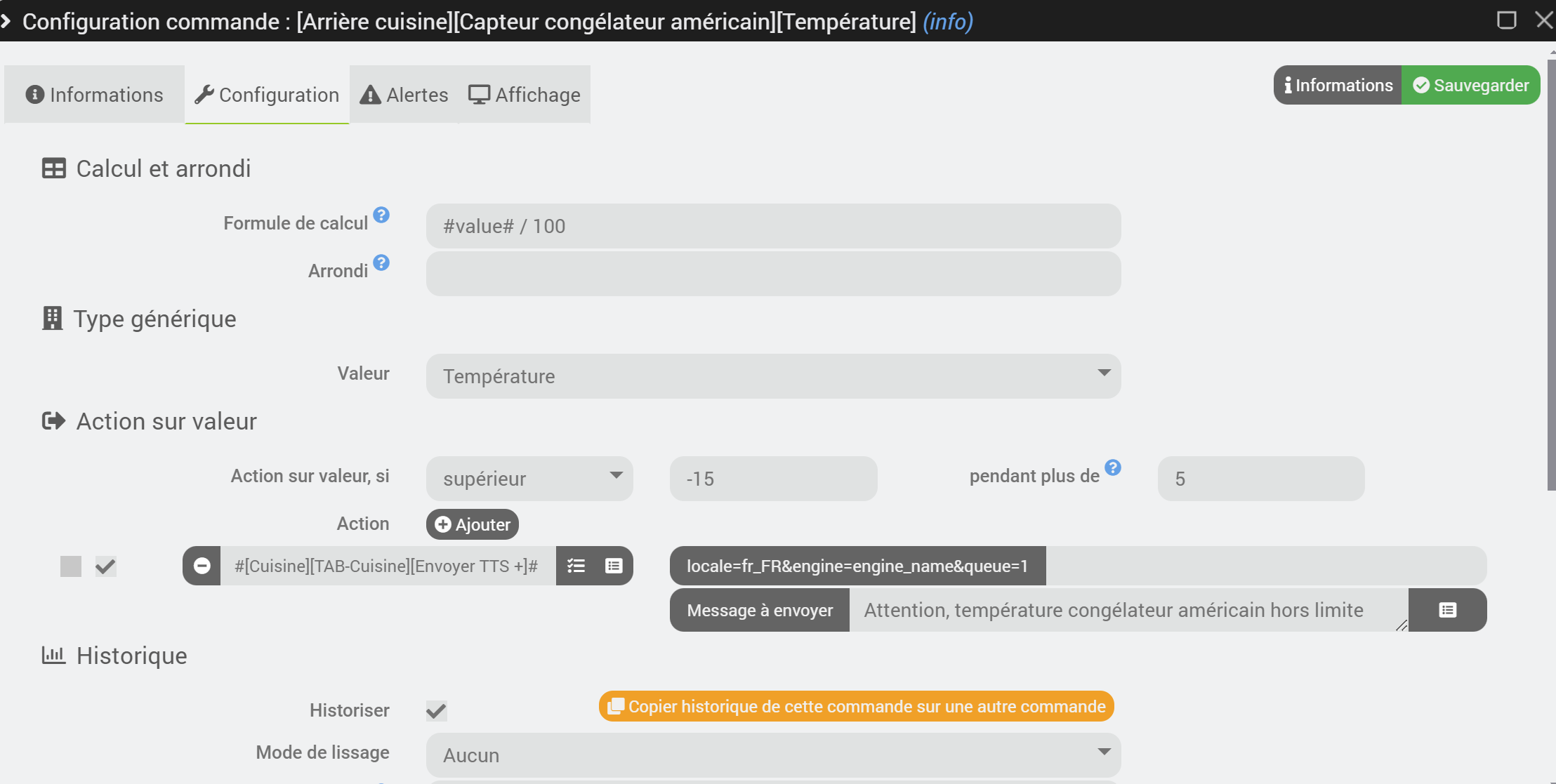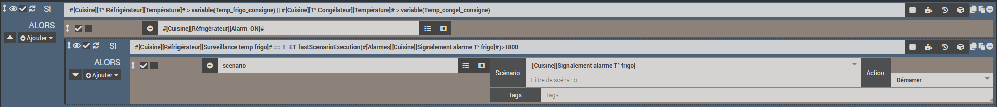 Sinon, j’affiche une alarme sur jeedom (un simple voyant) et je teste l’heure de la dernière exécution de ce scénario avec lastScenarioExecution(#[Alarmes][Cuisine][Signalement alarme T° frigo]#)>1800.