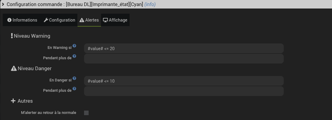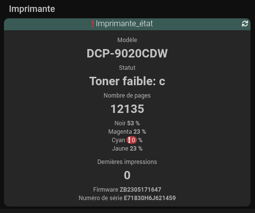 Il interroge cycliquement l’imprimante, Jeedom analyse les informations et génère les alarmes en fonction du paramétrage défini.