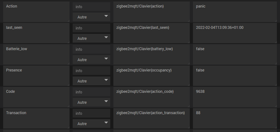 Pour que ton clavier zigbee fonctionne il faut que tu crées 2 commandes action (JMQTT) ou ordre (ZigbeeLinker).