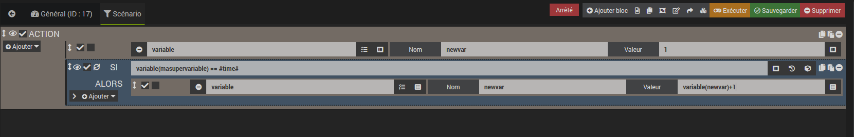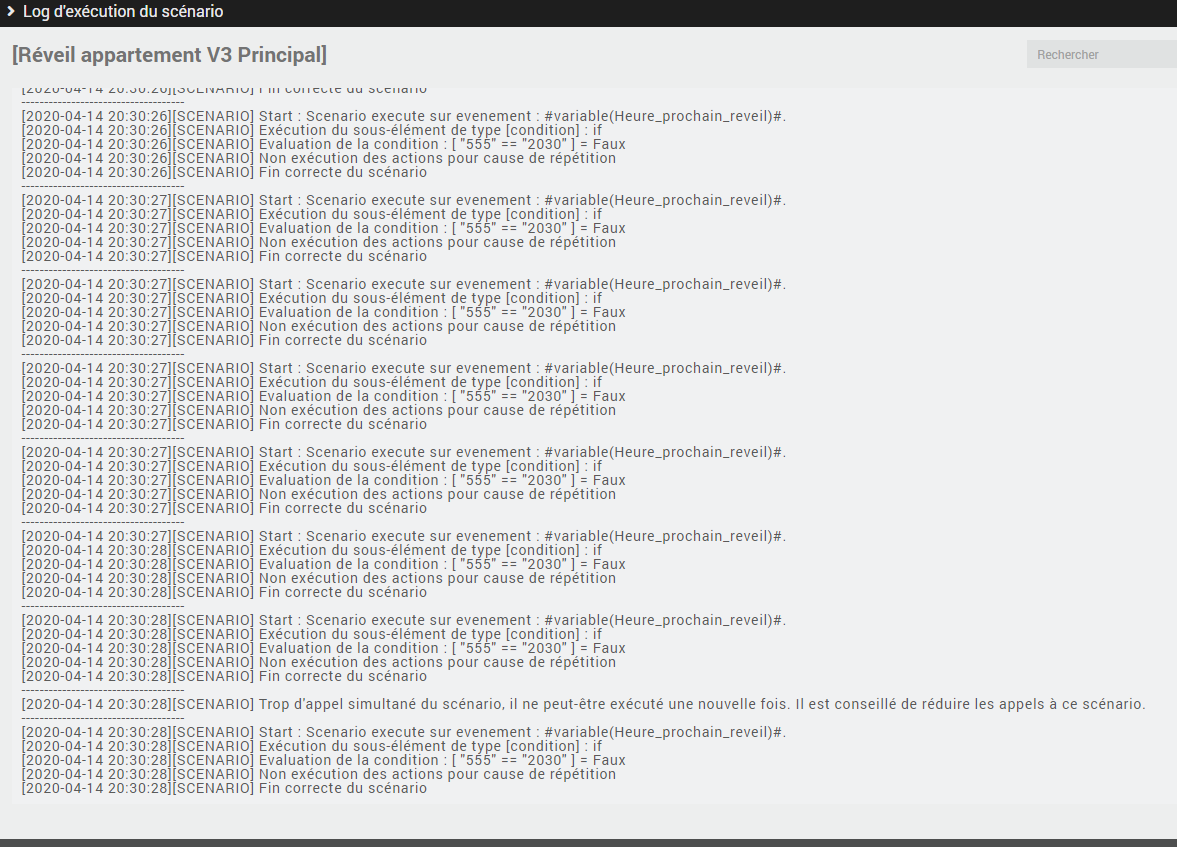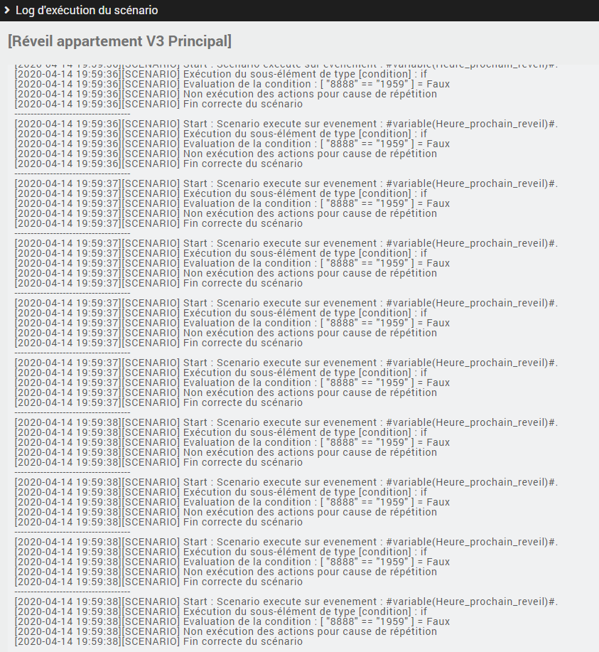 j’ai mis un déclencheur " variable(Heure_prochain_reveil) == « #time# » " mais ce scénario est en cours plusieurs fois par seconde et j’ai eu un message d’erreur « Trop d’appel simultané du scénario, il ne peut-être exécuté une nouvelle fois. Il est conseillé de réduire les appels au scénario » Je suis sur la version Jeedom 4.0.51.