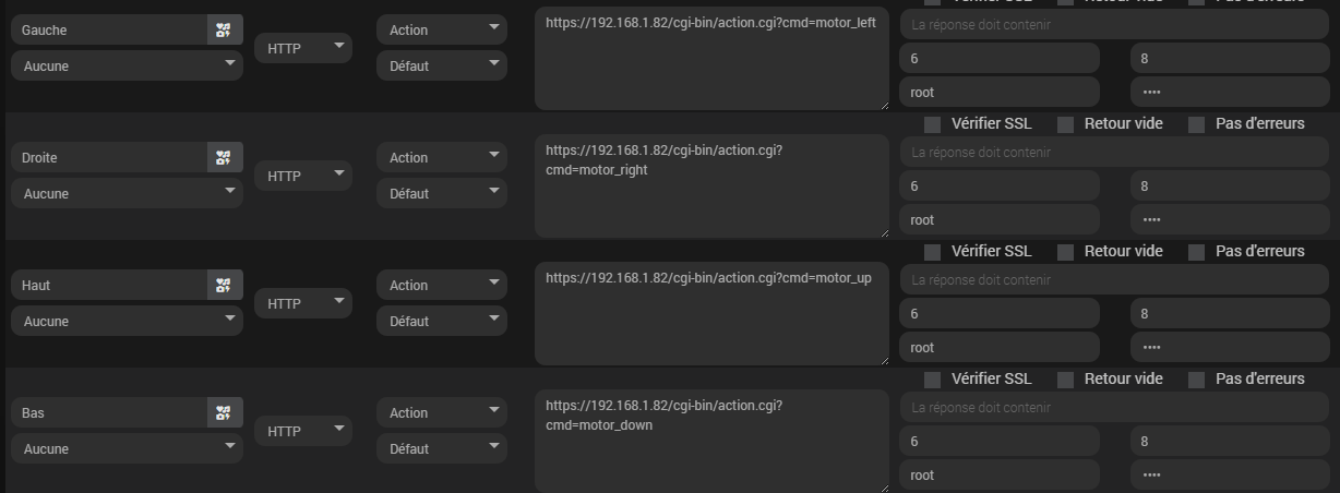 j’ai tenté de le faire aussi via le plugin script, ou la encore il m’indique que la requette HTTP est effectué mais rien ne se passe, alors que si je copie le lien qui est dans le script et je le met dans google chrome, la caméra bouge bien.