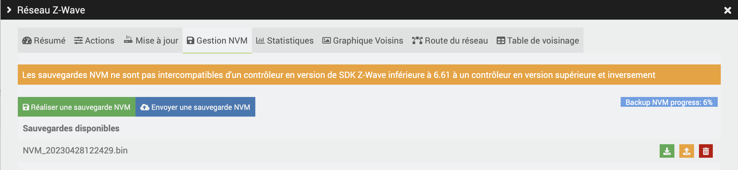 Comme je n’avais pas fait de sauvegarde NVM depuis longtemps (2023) et que j’ai rajouté des modules, j’ai voulu refaire une sauvegarde via menu Gestion NVM mais celle-ci n’aboutit pas ( 1er test bloqué à 2%, 2ème test bloqué à 6% cf capture d’écran).