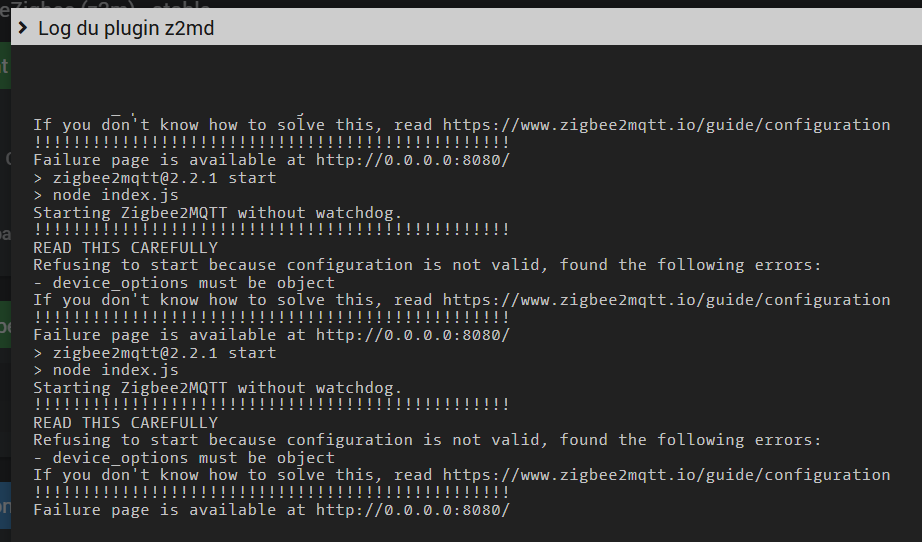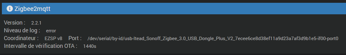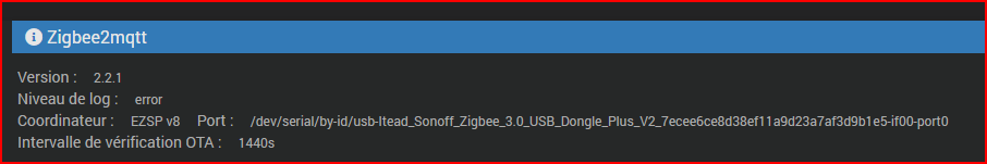 J’ai un problème identique depuis quelques versions. Et je redémarre mon serveur mosquito, j’ai l’impression que zigbee2mqtt ne refait pas la connexion. Avec message dans les logs comme quoi il n’arrive pas à se connecter . pourtant tout semble vert. Solution : redémarrer zignee2mqtt