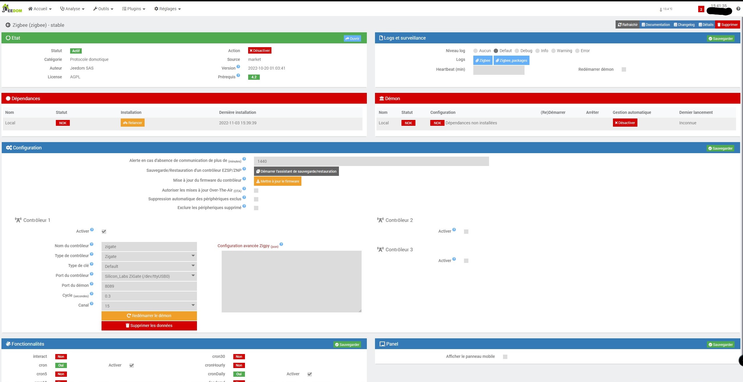 edit : bon j’ai cassé pas mal de choses avec mes différentes maj. j’ai désinstallé/réinstallé le plugin Zigbee, il me mettait tout OK c’était chouette, mais une erreur rouge en bas à droite lorsque je veux passer la zigate en inclusion. pas eu le temps de noté l’erreur, et elle n’apparaît pas dans les logs. donc je relance une installation des dépendances, ça dure, le log indique