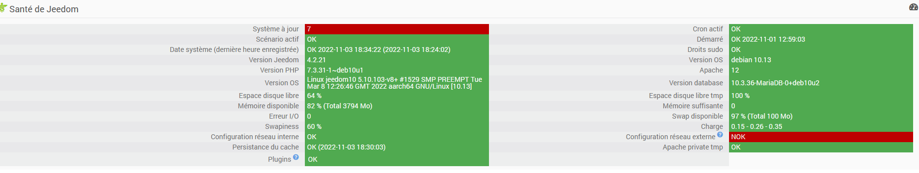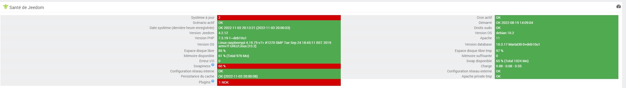 la page santé me dit que je suis trop haut en swapiness (60%) et que j’ai un pluggin NOK (le Xiaomi, ça déconne depuis la dernière MAJ, mais le plugin fonctionne) et que j’ai 2 MAJ à faire (Jeedom, que je ne fais pas, j’attends une montée en 4.4 ; weather que je ne fais pas tout fonctionne pour le moment).