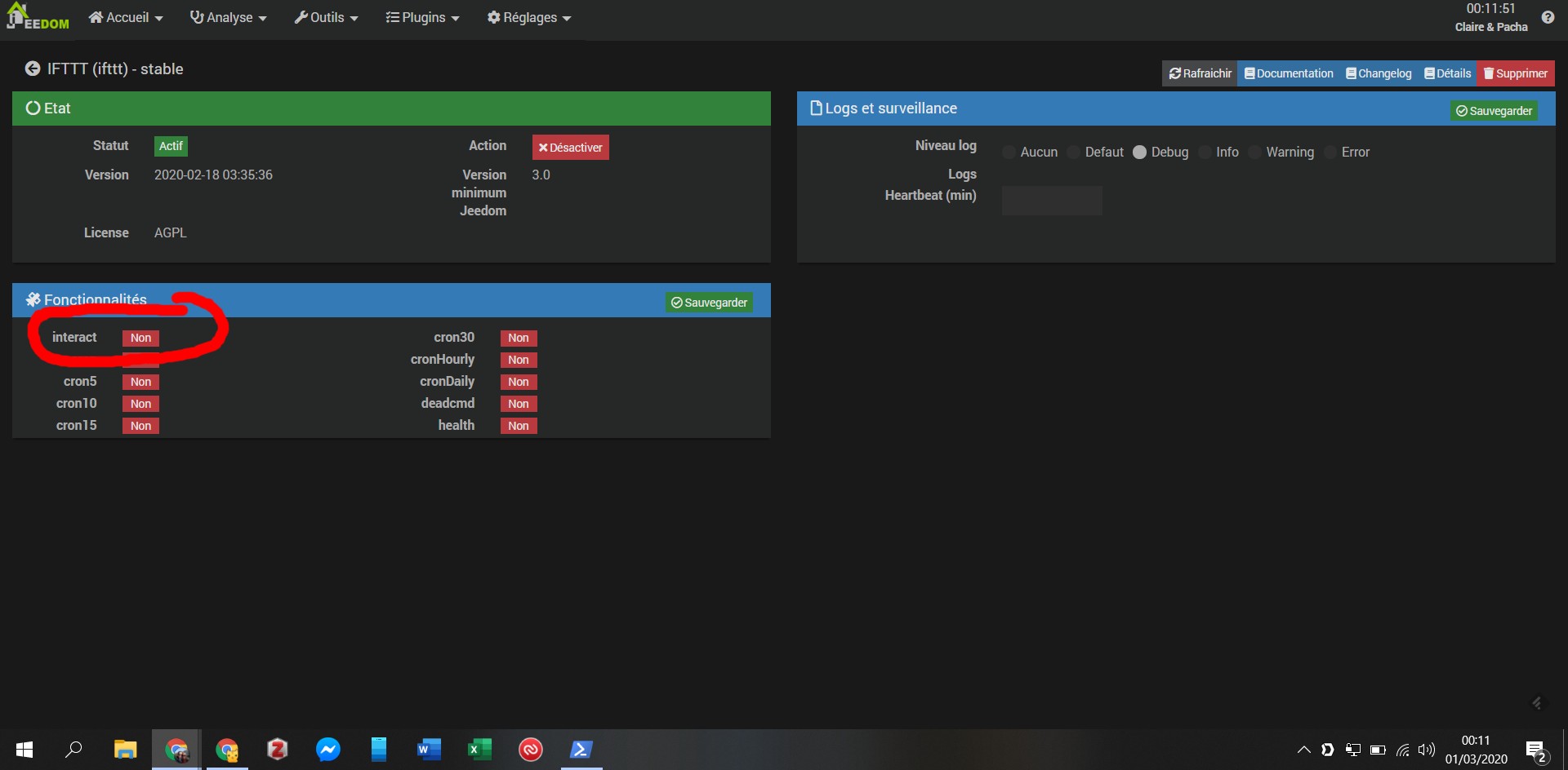 Cependant à chaque commande envoyée via IFTTT, sur mon jeedom j’ai quelques secondes après ce message d’erreur venant de JeeEvent : « Vous n’êtes pas autorisé à effectuer cette action 1, IP : XXX.XXX.XXX.XXX »