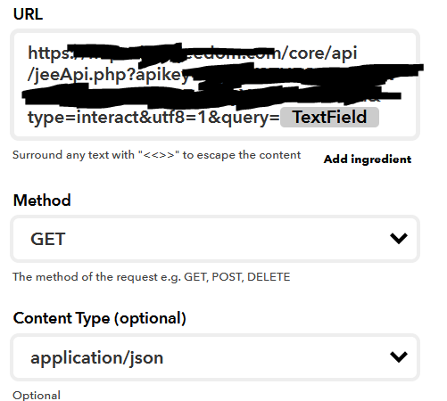 dans IFTTT, j’ai créer un applet ou if correspond à la requête Google Assistant « Say a phrase with a text ingredient ». Dans What do you want to say? j’ai bien mis « Maison $ ». Ensuite IFTTT doit faire une requête Web avec Webhooks qui est paramétrée ainsi : « https://nomdomaine/core/api/jeeApi.php?api=XXXXXXXXXXXX&type=interact&query={{textfield}}&utf8=1 », méthode de type GET pour contenu de type application/json.