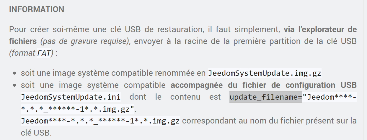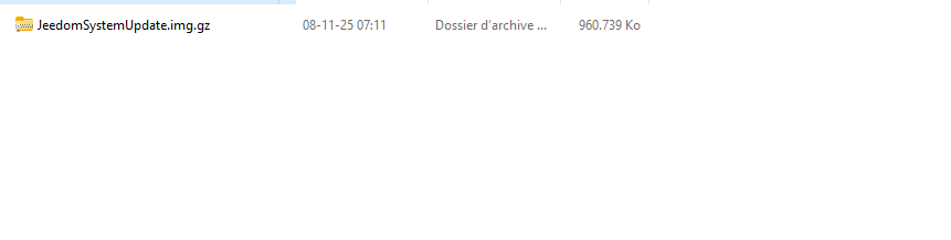 bonjour. Après la mise à jour de mon atlas qui c’est mal passée, j’ai perdu l’accès à ma box. J’ai essayé une restauration via une clé usb mais qui ne fonctionne pas non plus. Sur cette clé, j’ai téléchargé l’image JeedomAtlas-4.4.20_Bullseye-11.11.img.gz que j’ai renommé en JeedomSystemUpdate.img.gz. J’ai placé la clé dans le port usb supérieur droit et redémarré la box mais la restauration ne se fait pas. Quelqu’un a-t-il un conseil à me donner? Merci.