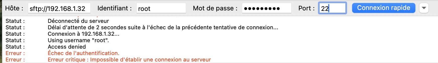 Pour te connecter avec filezilla il faut l’ip de la box, le port : 22 et le login et mot de passe SSH de la box.