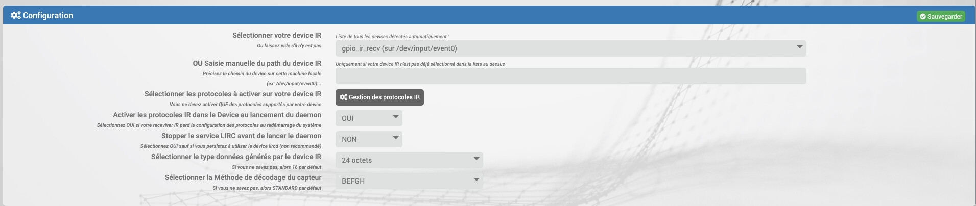 j’ai réussi à configurer mon raspberry avec ce boitier, mais je bloque sur le device « Lecteur IRv3 »