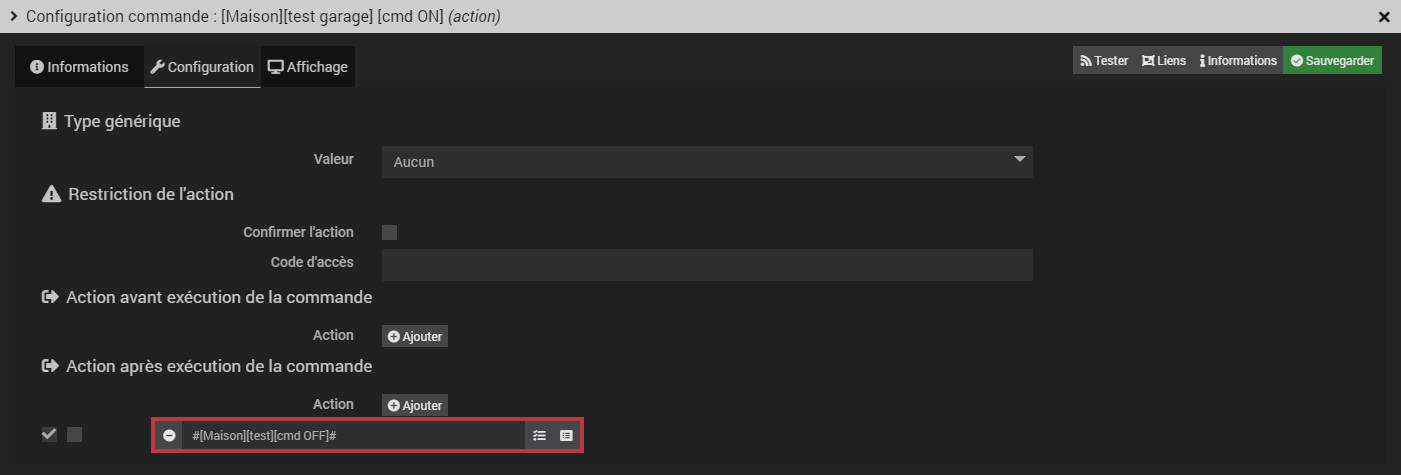 Donc il faut créer une 2ème commande de remise à 0 et configurer la commande de mise à 1 de sorte de rajouter une pause de 1 seconde (c’est ce qui est fait avec la commande retour) et d’exécuter la commande de remise à 0 à la suite (dans la configuration de la commande « Action après exécution de la commande »). Et ce pour toutes les commandes qui nécessitent une impulsion.