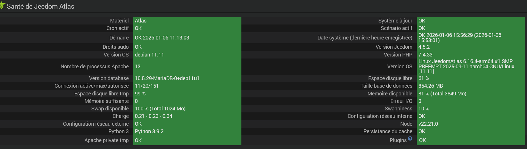 bonjour, je re-ouvre ce post après tenté de redémarrer le plugin Rflink suite a la mise a jour de mon Atlas en Debian 11. J’ai suivi le post précédent et appliqué la (les) solution proposée par Chris94440 que je remercie d’ailleurs car le plugin est à nouveau OK .(dependances et daemon) par contre je n’ai pas de remontées de mes équipements et les commandes n’aboutissent pas. ci joint un copie de la page santé de Atlas