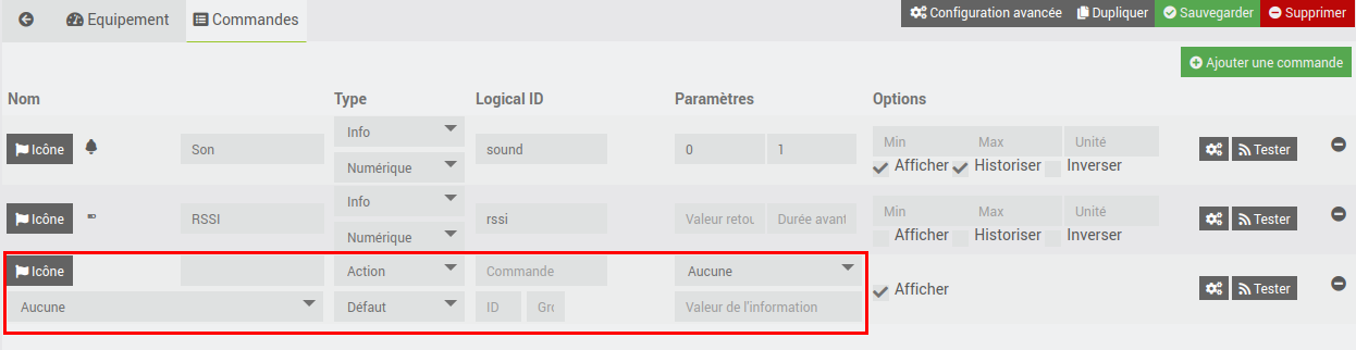 Et la suite que je ne sais pas faire. D’après ce que j’ai compris, il faut ajouter une action dans l’équipement, mais il y a plein de champs dont je ne comprends pas la signification, comment faut il les remplir ?