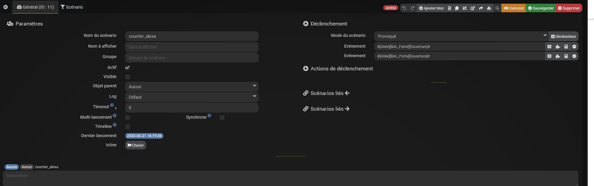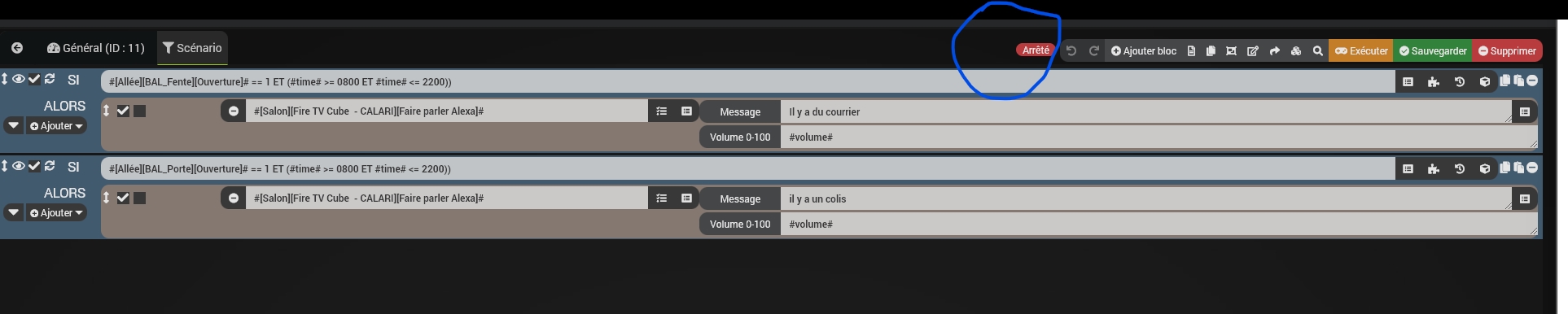 Maintenant j’ai acheté le plugin agenda dans le but de « n’activer » ce scénarios qu’à certaines heures de la journée (pas envie qu’on me réveille dans la nuit si une personne distribue un prospectus )