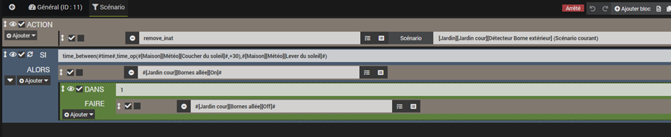 J’avais eu de l’aide il y a peut-être 3 ans environ pour faire un scénario qui se déclenche lors d’une détection d’un capteur et si 30min après le coucher du soleil, et qui s’arrête lors du lever du soleil.