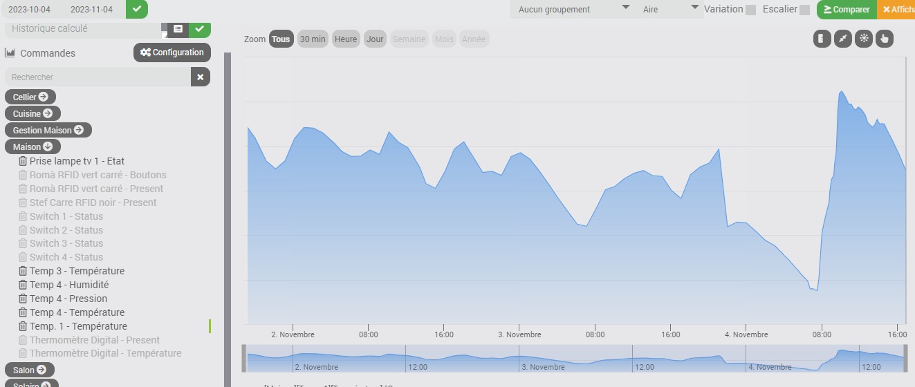 [2023-11-04 17:01:48][SCENARIO] – Start : Scenario execute automatiquement sur evenement venant de : [Maison][Temp 4][Temperature] (15.53). [2023-11-04 17:01:48][SCENARIO] - Exécution du sous-élément de type [condition] : if abs(#[Maison][Temp 3][Température]# - #[Maison][Temp 4][Température]#)>=2 [2023-11-04 17:01:48][SCENARIO] Evaluation de la condition : [5.23>=2] = Vrai [2023-11-04 17:01:48][SCENARIO] - Exécution du sous-élément de type [action] : then [2023-11-04 17:01:48][SCENARIO] Exécution de la commande [Maison][Prise 7 ventilateur ][On] [2023-11-04 17:01:48][SCENARIO] Fin correcte du scénario