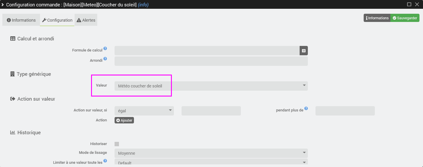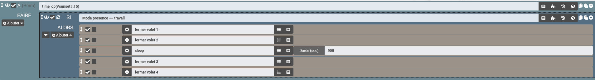 tout action sur un module Z-Wave+ fonctionne sans pb. des scénarios simples pour gérer ma hifi, fonctionne également. Et là, je me casse les dents sur un scénario « coucher du soleil » (fonctionnalité interne à Jeedom).